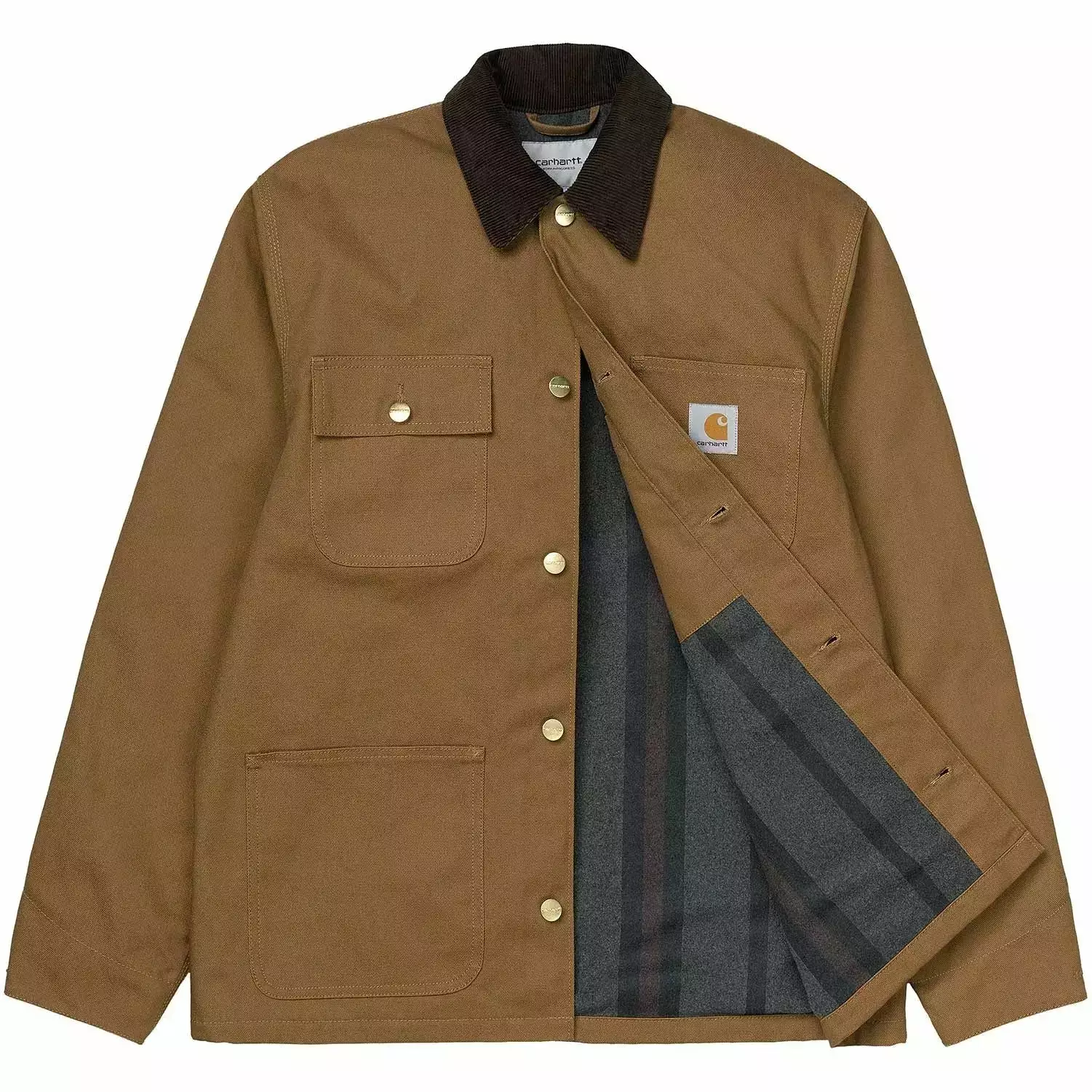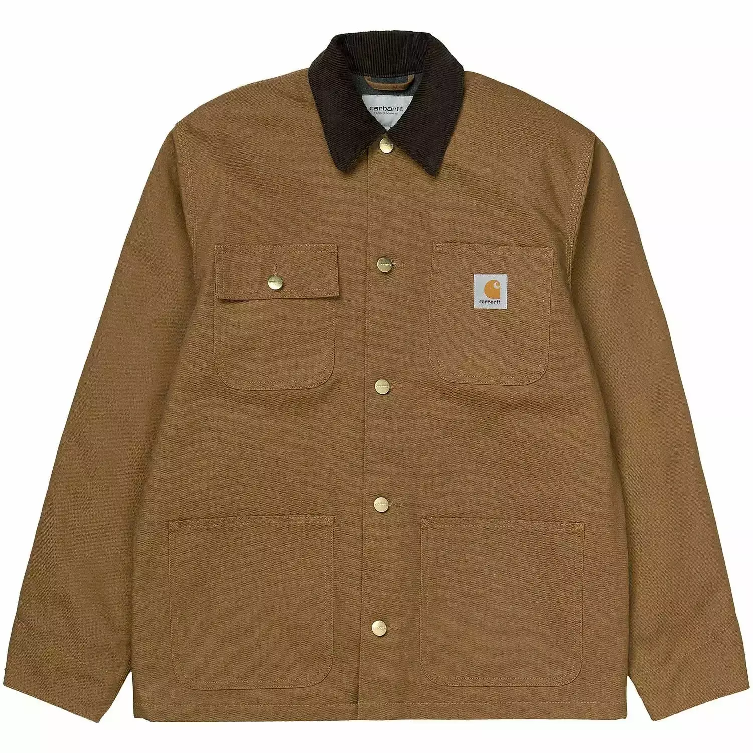 The Carhartt Michigan Coat has an Dearborn Canvas organic cotton construction, making the coat durable and ideal for any casual occasion. The coat features a stylish corduroy collar and offers space to store your essentials with four front pockets. The coat has button closure and is finished with a woven Carhartt label to the left chest pocket.Â